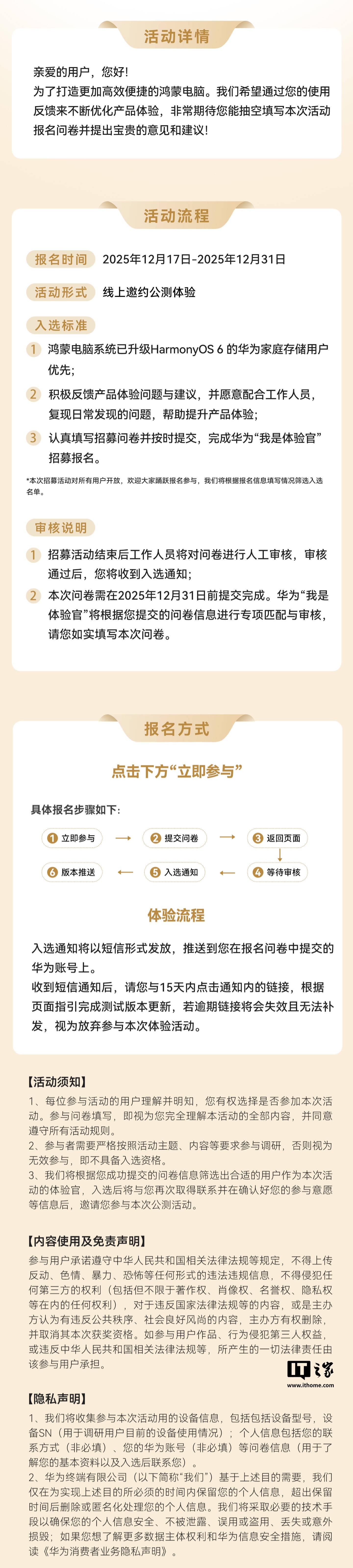 IT之家 12 月 17 日音书,我的华为 App 举止页面理会,华为鸿蒙电脑家庭存储文档同步体验官举止今启招募(2025 年 12 月 17 日~2025 年 12 月 31 日)。